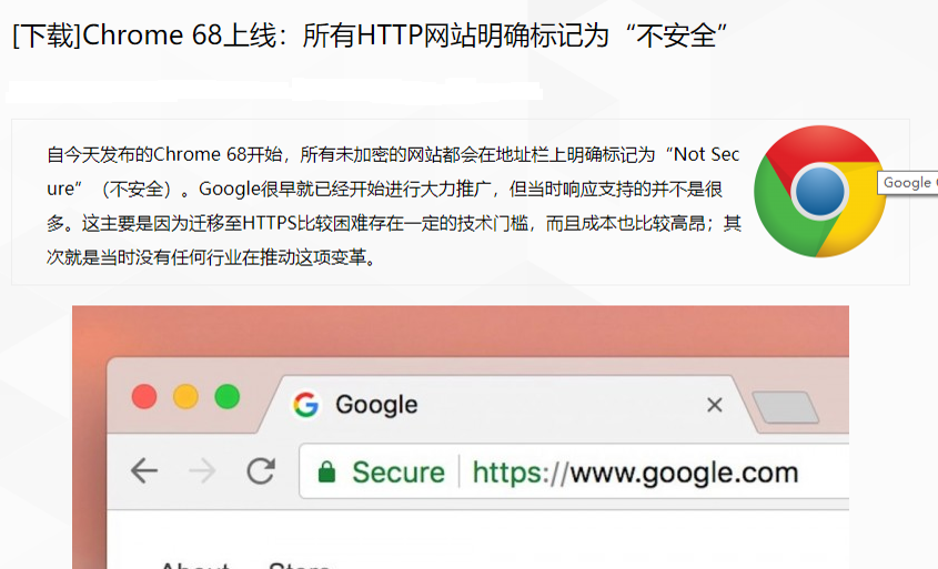 2018年起,谷歌发布的Chrome 68开始,所有未加密的网站都会在地址栏上明确标记为“Not Secure”(不安全)。