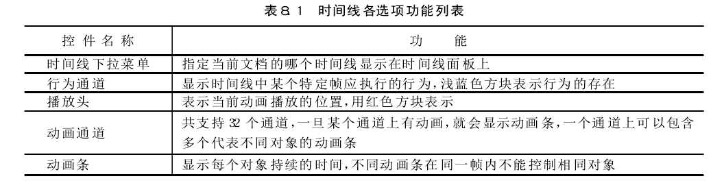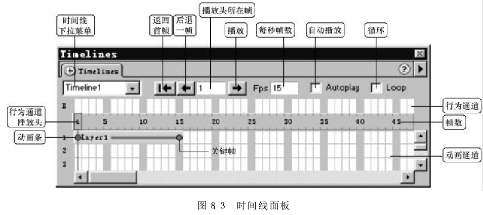 "Timeline(时间线)”面板描绘了层和图像随时间变化的属性。在菜单栏中选择“Window"→"Timelines"命令可打开时间线面板。时间线面板所包含的控件如图所示。