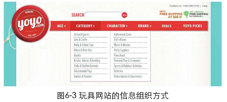 比如,一个玩具网站可以从适用年龄、玩具类别、特点、品牌几个方面,对玩具进行组织分类,如图6-3所示。