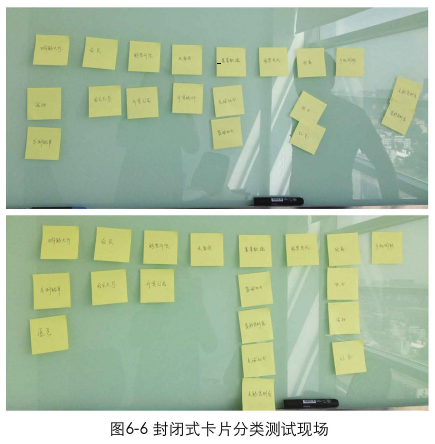 封闭式:网站制作设计师首先会将导航的架构设计好,确定出导航的个数和名称,再将属于这些类目的卡片分发给用户,让用户根据自己的期望,把卡片归类在不同的导航分类下。如果有些卡片用户不知道该将它分到哪个类目下,可以将它拿出来,所有卡片不一定要全部分完。封闭式的分类更利于掌控,可以用于对信息设计的结果进行验证的阶段,如图6-5.图6-6所示。