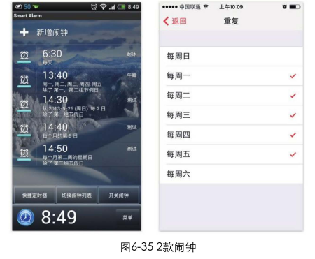 图6-35所示为2款闹钟应用。一款提供了非常强大的功能。在设置闹钟时可以有多种重复方式:每天、每周的某些日子、每周的某些日子和第N组节假日、仅第N组节假日、每隔N日、每月的某一日、每月第N周的某日,另一款只是简单地让用户选择每周几重复。如果是你,会喜欢哪款呢?