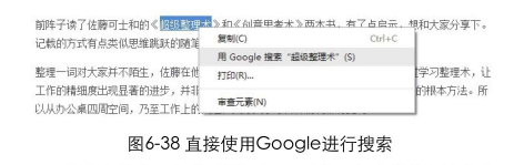 以前我们在浏览网页时,看到一个想去了解更多的词会怎么做呢?我在一篇文章中看到一本书,叫做《超级整理术》。我并不清楚这本书讲了什么内容,想去了解一下。于是我选中这几个字,点击鼠标右键复制,在浏览器中新建个标签页,打开Google,在搜索栏中右键粘贴,点击"搜索”按钮。经过这一系列的操作之后,我终于在搜索结果页中看到了关于这本书的简介、评价、购买信息,等等。其实这整个过程也只是会耗费几十秒的时间,操作起来并不会觉得太难。直到有一天,我在使用Chrome浏览器的时候发在复制操作的下方,有一个"用Google搜索"XXX,"的选项,只需点击这一选项,浏览器就会自动弹出一个标签页,把我要的结果搜索出来。“选中-右键复制-新建窗口一打开网站-粘贴-搜索"这一复杂的过程就变成了"选中右键点击Google搜索",只需2步,轻松完成任务,如图6-38所示。