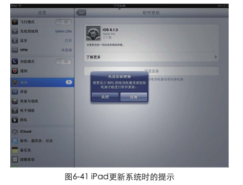 iPad在更新系统时,会提前检测用户的电量。如果电量不足以支撑完成更新,会提示用户将iPod插上电源再来更新。试想一下,如果没有这个提醒会怎样呢?用户花费了大量的时间下载更新,在安装到一半时却因为没电而关机了!用户需要连接电源再次重新更新,更新的过程虽然没有冗余步骤,但因为缺少预先提示而导致的重复操作也会使操作流程变复杂,如图6-41所示。