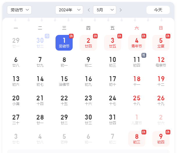 放假时间:2024年5月01日(周三)——2024年5月5(周日),共5天。